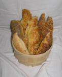 | Kaesestangen, Salzstangen, Mohnstangen, Sesamstangen. Aus Broetchenteig. |