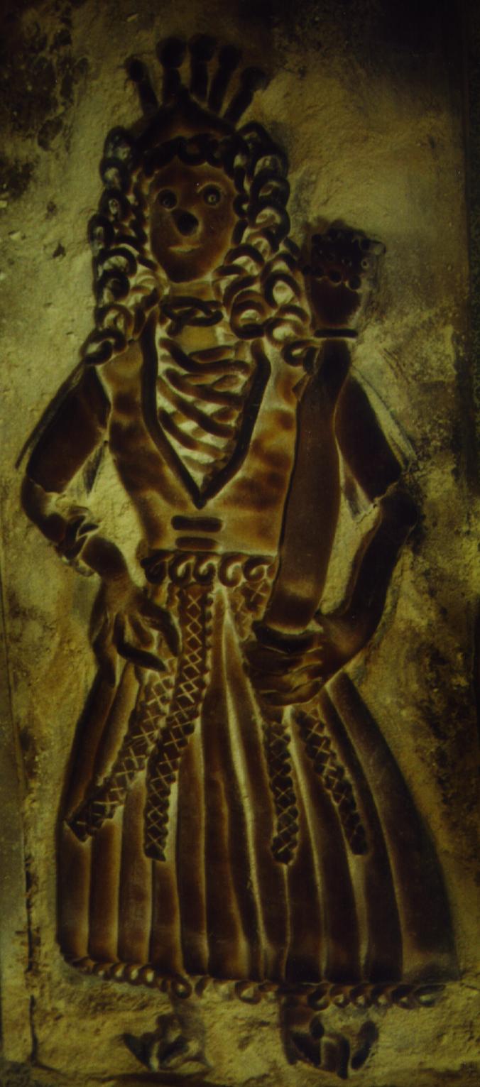 geschichtlich gesehen nur lithurgisch angehaengte und spaeter fehlinterpretierte Stierhoden, so blieben von der Schlangengoettin bei der lebkuchenen Endinterpretation noch die Rockmuster, das die Brueste offenlegende Korsagentuch sowie die Umgestaltung der Schlangen zu den eher Lebensbejahenden Blumensymbolen. Die drei Brueste stellen dabei das modernisierte Symbol der Fruchtbarkeit dar, denn ohne die dem Saeugling den taeglichen Lebenssaft gebenden Milchspender gaebe es keine Fortpflanzung, kein neues Herz in der Welt
